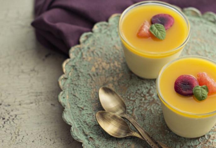 3、取1/2黄桃果泥加入到布丁液搅匀,倒入容器中,放入冰箱冷藏3小时左右,至布丁液凝固;取出淋上果泥,即可食用。