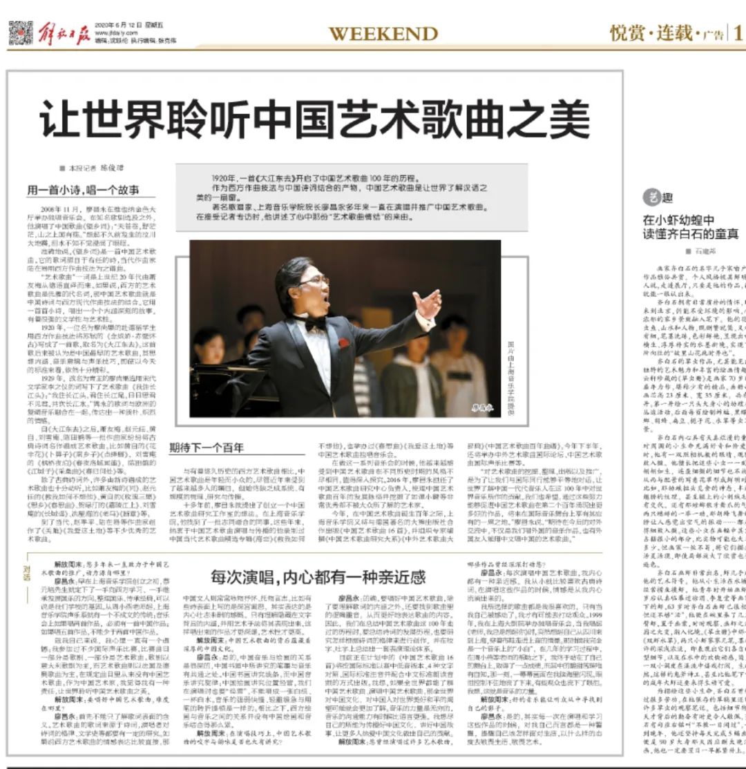 继5月18日我音隆重发布“中国艺术歌曲百年”系列活动项目,引发全国20余家主流媒体广泛关注后,《解放日报》·上观新闻再度聚焦“中国艺术歌曲”推广的文化价值和世界意义,并对我音校长廖昌永教授进行专访。
