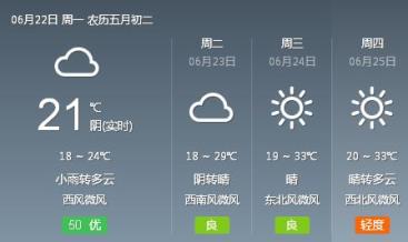 ▲陕西省气象台预计,受低层切变及西南暖湿气流共同影响,预计21日晚到23日,全省大部有小雨或阵雨。预计西安地区今天(22日)阴天有阵雨,22-26℃,偏西风2-3级。23日多云转阴天,有分散性阵雨,19~28℃。24日多云转晴 ,19~32℃。