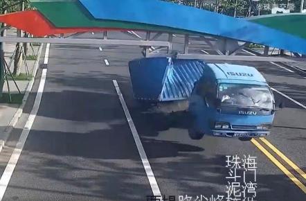 ▲据珠海交警消息:6月15日,广东珠海斗门一辆小货车与限高架发生碰撞。碰撞的瞬间车厢从车体脱落,腾空挂在限高架上,而车头则弹射出去,在地上“跳”了几下。事后司机牛某看到自己的“神操作”也哭笑不得。交警认定,牛某行车时未留意限高架警示标志牌导致与限高架发生碰撞,负事故全部责任。