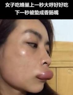 ▲近日,福建宁德,一段女子吃蜂巢被蜜蜂蛰成香肠嘴的视频在网络走红,网友纷纷笑称:原来电影里梁朝伟的香肠嘴是真的。对此当事人称,当天去福建宁德霞浦的大山里摇蜜,割了一个蜂巢吃,然后被蜜蜂蛰了脸,嘴巴肿成了香肠嘴,连喝水都会漏。