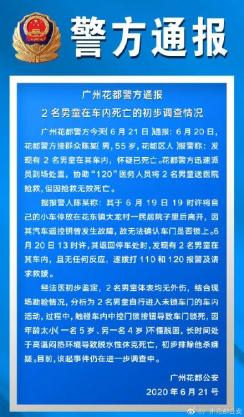 ▲21日,广州花都警方通报,20日,2名男童在车内死亡。经初步鉴定,2名男童系长时间处于高温闷热环境导致脱水性休克死亡。