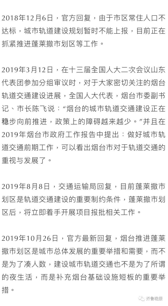 2020年1月21日,烟台一市民朋友在网上民声向交通运输局询问蓬长划区及烟台地铁最新进展,官方回复称:据了解,蓬莱撤市划区已经完成了审批流程,需国办正式下文批复。