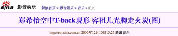 2006年郑希怡参加直播节目的空中飞人表演,在表演过程中却发生了意外,郑希怡的搭档钱嘉乐不小心将她的裤子扯了下来,当众露出T-back。