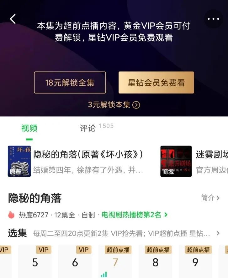 但是从这次的网剧《隐秘的角落》来看,超前点播依然存在,从第7集开始就要求“3元解锁本集,18元解锁全集”。似乎之前这件事对爱奇艺而言无关痛痒。