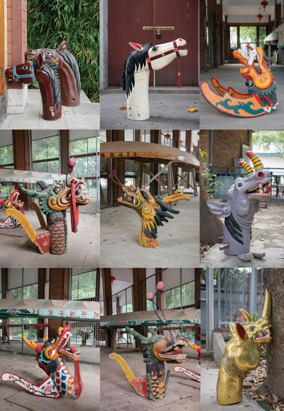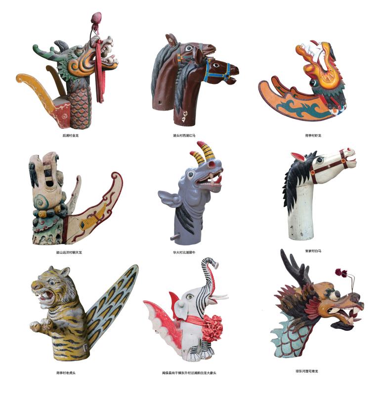 龙舟头——这便是福州龙舟最大的特色:船身有色彩鲜艳的鳞甲图案,船首的龙头可拆装,雕工精美,各里社村庄依本境的神灵信仰将之漆成不同色调、图案,如江边黄龙、远西白龙。但也有不是龙头的,如洋下村的鸡头,而且种类十分丰富。