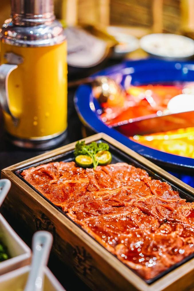 于是那口醇厚的牛油锅被搬了进来,生脆剔透的鸭肠被搬了进来,跨洋而来的雪花牛肉被搬了进来,荥经砂器、道明竹编、桂花龙窑、绵竹年画……四川各地的非遗手工艺术品也被搬了进来,在飘散的辛香气中,持续向来客输出厚重的天府文化。