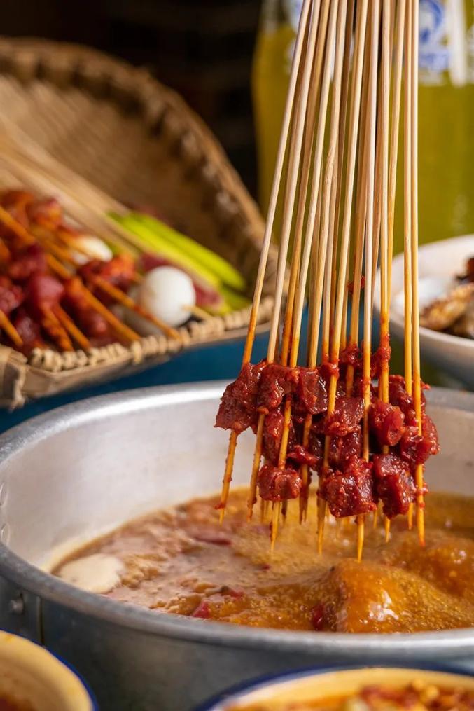好友围炉,共话于厅堂,几十把竹签串着新鲜的肉类食蔬在锅中涮烫,涮着吃着话讲着,成都味就出来了,也不管讲的是成都话、普通话或是哪门外语。