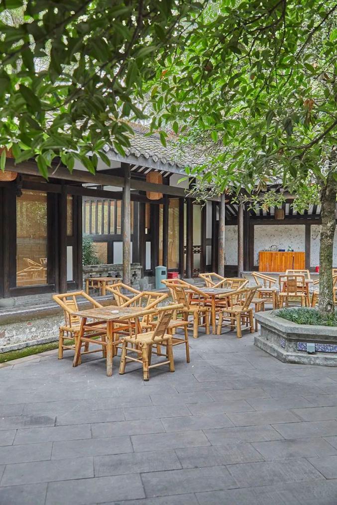 如何怡然?以川西小院打了环境基调,室内是实木桌椅,户外则用竹椅子与四方桌——这是成都人敞在户外喝茶、晒太阳的惯常搭配,讲个舒适。