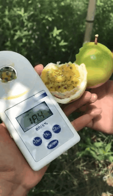 小伙伴在产地摘了一个还未成熟的百香果,糖度就已经有18.4度。等到完全成熟,黄金百香果的糖度更是能能达到19度左右。