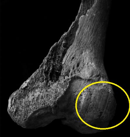 北京市发掘出的明代太监墓,其中一具人骨的左膝盖关节表面显示出“象牙面”。这是当软组织因年龄、劳动或者疾病原因消磨殆尽后,骨骼之间相互磨损而产生的光滑面,也代表个体生前可能要忍受膝痛。根据他的职业,不免联想到,这是因日常跪地动作在骨骼上留下的痕迹。