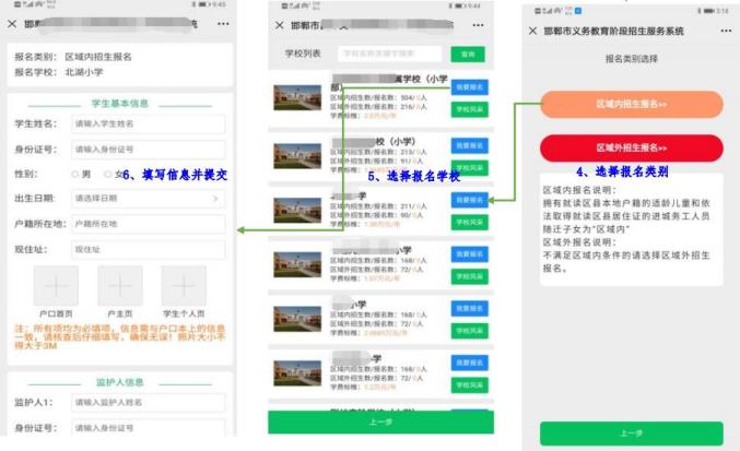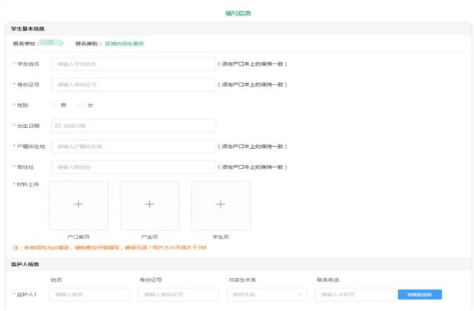 (4) 第四步,填写报名信息并提交报名,信息包括学生基本信息、户 口信息、监护人信息、居住证信息(外地户籍人员填写)等。报名信息需通 过监护人手机验证码进行验证。