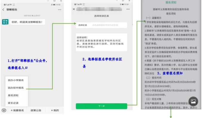 (2)第二步,选择【民办初中报名】入口,并选择民办初中所属区域。点击后弹出报名须知,认真阅读并勾选“已认真阅读报名须知并同意须知内 所有条款”后点击
