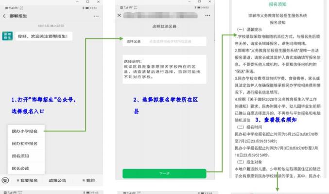 登录邯郸市“义务教育阶段招生服务系统”。用户可通过电脑浏览器 访问地址“http://hdzs.hdjy.net.cn”进行报名,也可通过微信搜索关注“邯郸招 生”公众号进行报名。