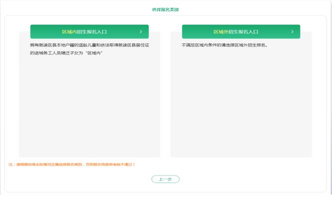 <开始报名>按钮;开始报名>报名区域说明:A. 区域内招生报名;B. 区域外招生报名。