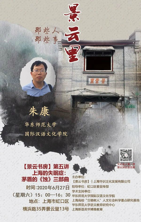 大家都知道茅盾先生的《蚀》三部曲,可是大家知道《蚀》三部曲创作于景云里吗?在景云里期间茅盾先生还有哪些方面的成就?6月27日,【景云书房】第五讲,我们有幸请到华东师范大学朱康老师为我们讲述上海的失眠症:茅盾得《蚀》三部曲。
