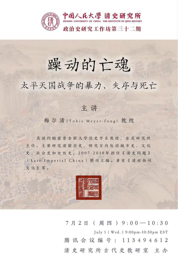 《躁动的亡魂:太平天国战争的暴力、失序与死亡》是梅尔清(Tobie Meyer-Fong)教授的一本新书。梅尔清主要研究清朝历史,研究方向包括城市史、文化史、社会史和女性史。在新书中,她用一段段备受劫难的普通人的人生故事,让读者得以窥见太平天国战争的实际影响。本次政治史研究工作坊,我们邀请到梅尔清教授,分享她的新书,与大家谈谈太平天国战争。
