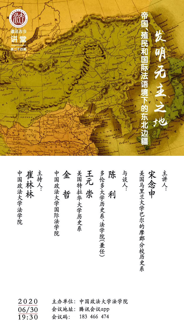 历史学者宋念申来到“道法古今讲堂”,主讲帝国、殖民和国际法语境下的东北边疆,并邀请多伦多大学历史系、法学院兼任副教授陈利,美国特拉华大学历史系副教授王元崇,中国政法大学国际法学院副教授金哲三位嘉宾参与对谈。