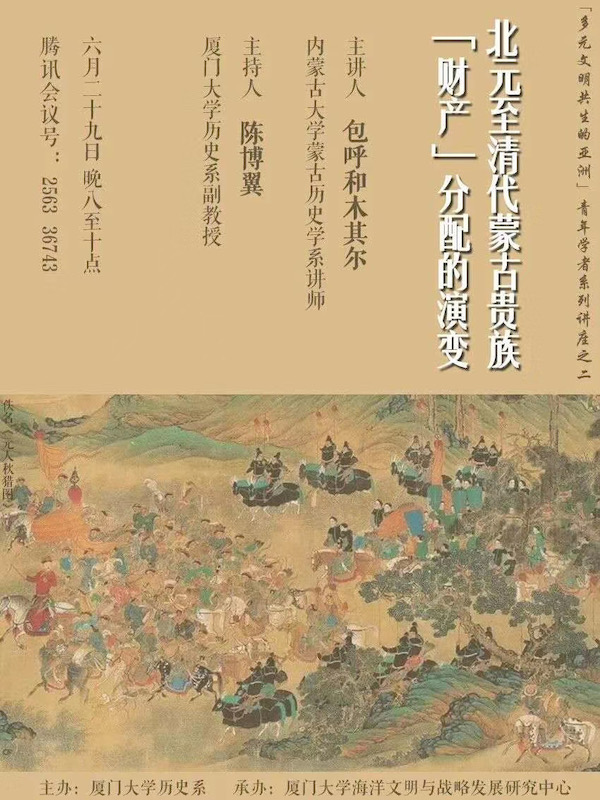 厦门大学历史系“多元文明共生的亚洲”青年学者系列讲座,第二讲邀请内蒙古大学包呼和木其尔老师主讲北元至清代蒙古贵族“财产”分配的演变。