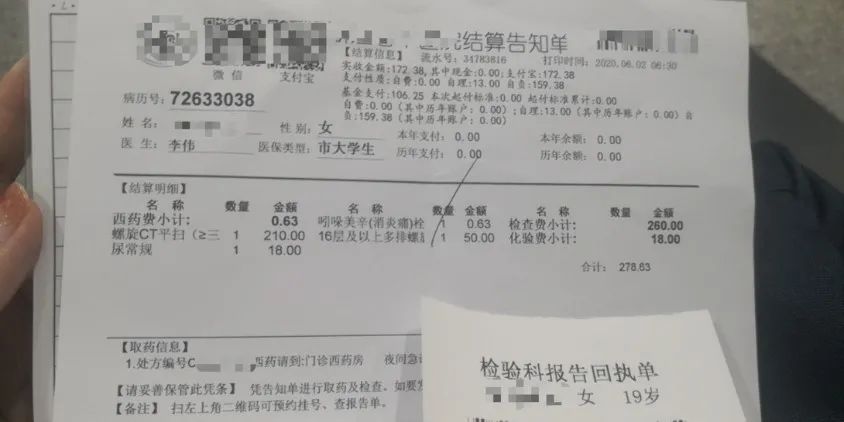 5点50,离宿舍开门还有十分钟,我疼得实在忍不住,叫醒了宿管阿姨。阿姨给我开了门,目送我去临时值班点。值班点的工作人员告诉我,他们只处理发热病人,但看我疼到走不动路,还是好心地为我打了学校的医疗值班点的紧急电话,对方答应用车把我送到医院。