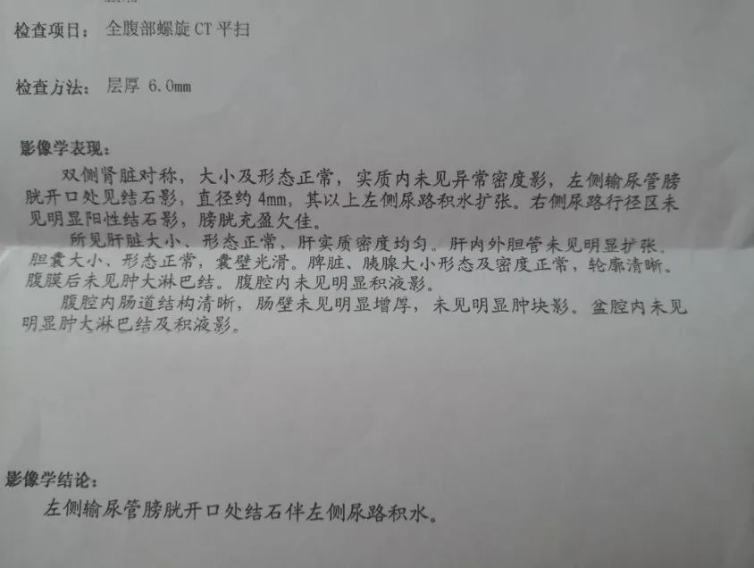 尿检和CT结果很快就出来了,尿液中的红细胞是正常值上限的近700倍,把我吓得不轻。CT结果显示,左侧输尿管膀胱开口处结石,伴左侧尿路积水,而这块折磨了我一个上午的结石,只有4mm大。由于可以自行排出,所以我一直担心的超声波碎大石的情况并没有发生。