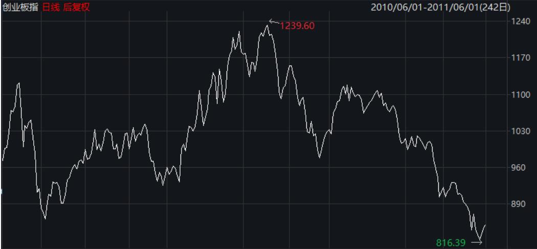 2009年10月30日,中国创业板正式上市。2010年6月1日,深圳证券交易所正式编制和发布创业板指数。6月1日到6月11日,10天的时间,创业板指从1000点冲到了1100多点,上涨超过10%。而后,便开始了回撤。7月2日,创业板指一度跌至832点,成为阶段性低点。后又探底回升,2010年12月20日,创业板冲上阶段性高位1239点。