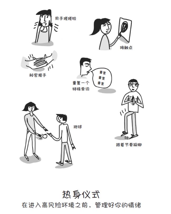 “热身仪式”是在即将进入高风险场景之前,你要采取的一些小的身体动作。此类仪式来源于运动员在平时训练或比赛开始前的练习。它们通常是一组动作,有时还需要重复一些特殊的词汇——所有这些都是为了让你在面临挑战时进入正确的思维状态,从而保持专注、取得成功,例如销售推介、谈判、高管会议或向一大群人做演示。