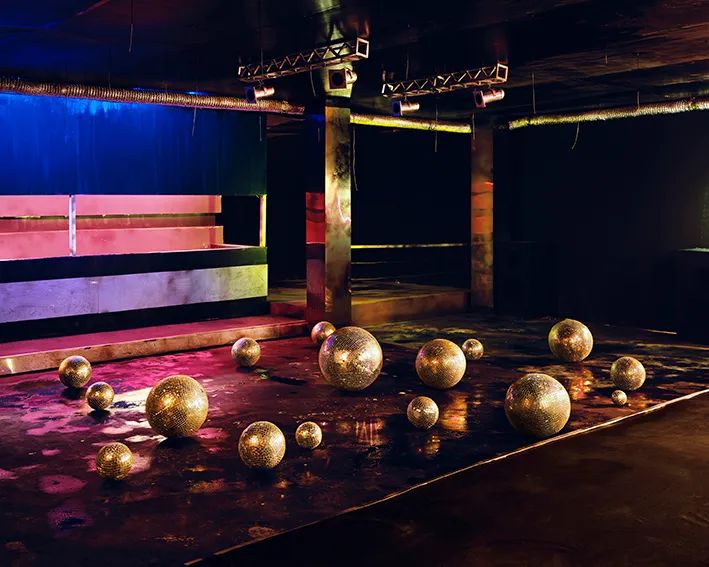 陈维以都市夜生活中的人物和场景作为主题的系列摄影与装置作品,是这一主题项目的终章呈现。通过实体搭建舞台场域,综合运用光线、色彩等要素,进而构建出空间界限不明的叙事环境。在他的作品中,年代模糊的舞池氛围往往潮湿氤盒,透露出强烈的现场感。在摄影作品《的士高》和《在浪里》的拍摄过程中,陈维引导都市青年们在舞池中表现出陶醉,进而捕捉人物在音浪里身形隐去的肢体语言,以及忘我迷惑的精神状态。而在有景无人的摄影作品《舞池系列》中,空旷舞池里的镜球,色彩斑斓的马赛克墙,冰冷泛光的镜面,流动着广告图像的霓虹灯箱,则宛如一出狂欢的默剧即将开场,又像是都市夜晚散场后一出疲惫失落的群像。