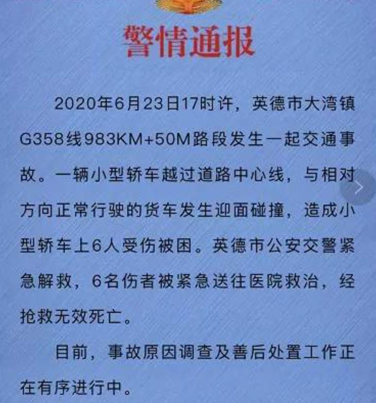 4. 广东一轿车与货车相撞,致6人遇难 24日晚,广东英德市公安局发布通报,6月23日17时许,英德市大湾镇G358线983KM+50M路段发生一起交通事故。一辆小型轿车越过道路中心线,与相对方向正常行驶的货车发生迎面碰撞,造成小型轿车上6人受伤被困。警方紧急解救,6名伤者被紧急送往医院救治,经抢救无效死亡。目前,事故原因调查及善后处置工作正在有序进行中。(广州日报)