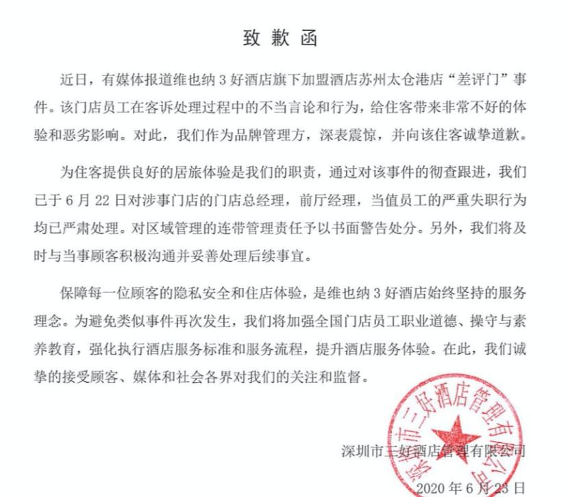 24日,维也纳酒店官博对该事件发出致歉信称,该门店员工在客诉处理过程中的不当言论和行为,给住客带来非常恶劣的影响。“作为酒店管理方深表震惊,并向住客诚挚致歉”。致歉信中指出,酒店管理方已于6月22日对涉事门店的门店总经理、前厅经理和当值员工的严重失职行为严肃处理。(@维也纳酒店、澎湃新闻、潇湘晨报)