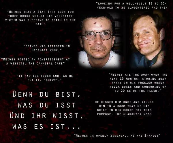这类案件中最臭名昭著的是阿曼·梅韦斯,他在一个恋物癖网站上发布了一条寻找愿意被吃掉的志愿者。最终43岁的芯片设计师布兰德赴约,被梅韦斯杀死之后,布兰德身上有20公斤的肉被吃下了肚。