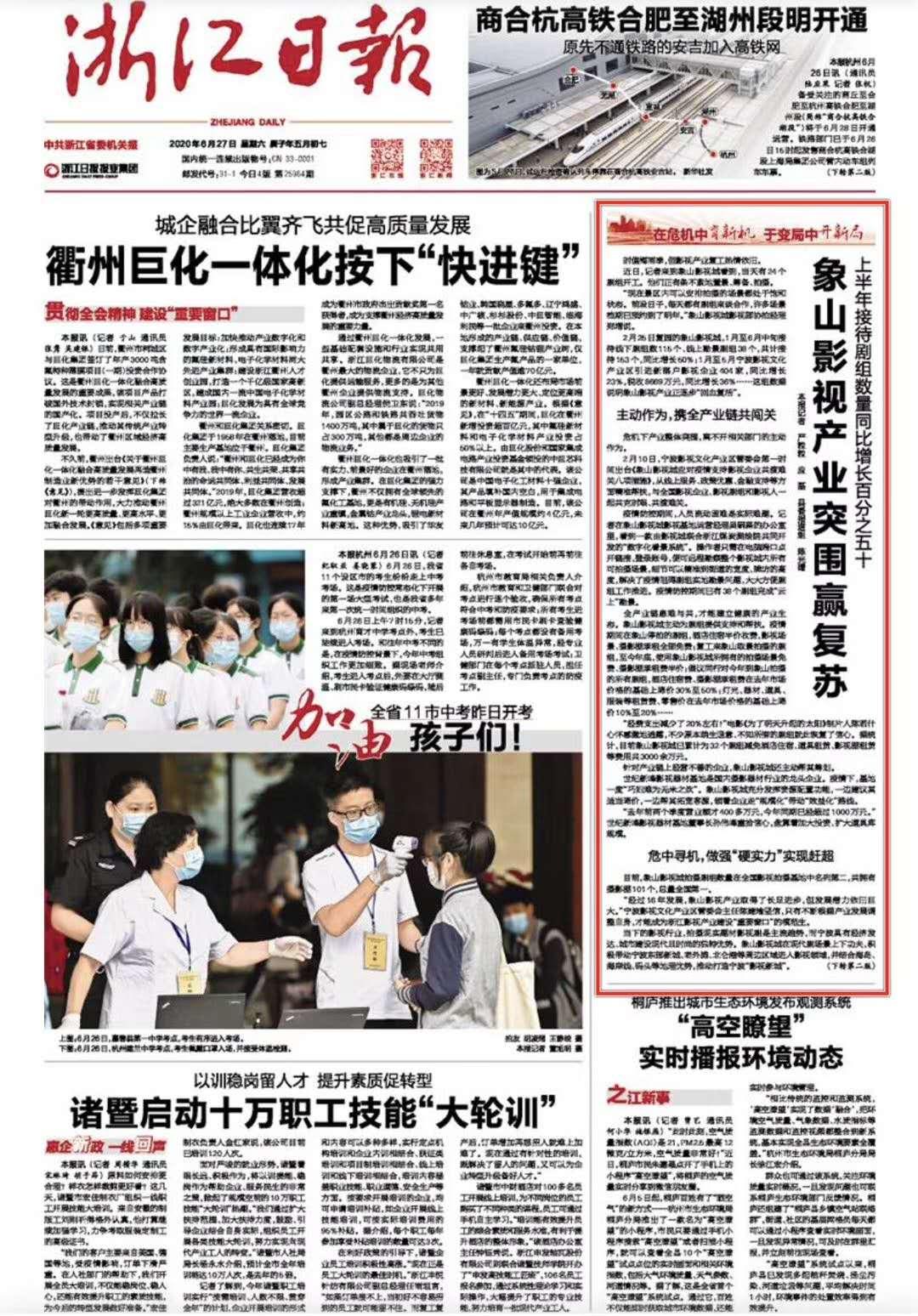6月27日,《浙江日报》头版、《宁波日报》头版双双报道了象山影视产业,一起来看看吧!