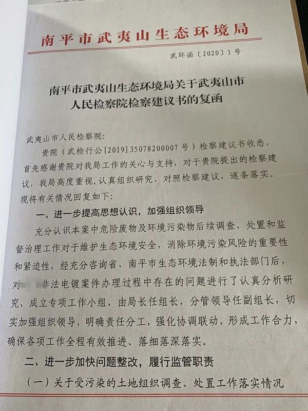 武夷山生态环境局在收到我院发出的行政公益诉讼诉前检察建议后高度重视,认真组织研究,对照检察建议,逐条进了落实,并将整改方案函复我院。