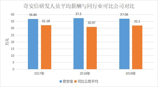 网络安全行业较为重视研发投入及研发人员的储备,研发费用的主要支出为研发人员的职工薪酬,2019年,同行业可比公司研发人员职工薪酬占研发费用的平均比例为 75.16%,而奇安信的研发人员职工薪酬占研发费用的比例高达 82.22%,这也是因为奇安信研发人员平均薪酬高于同行业可比公司平均水平。