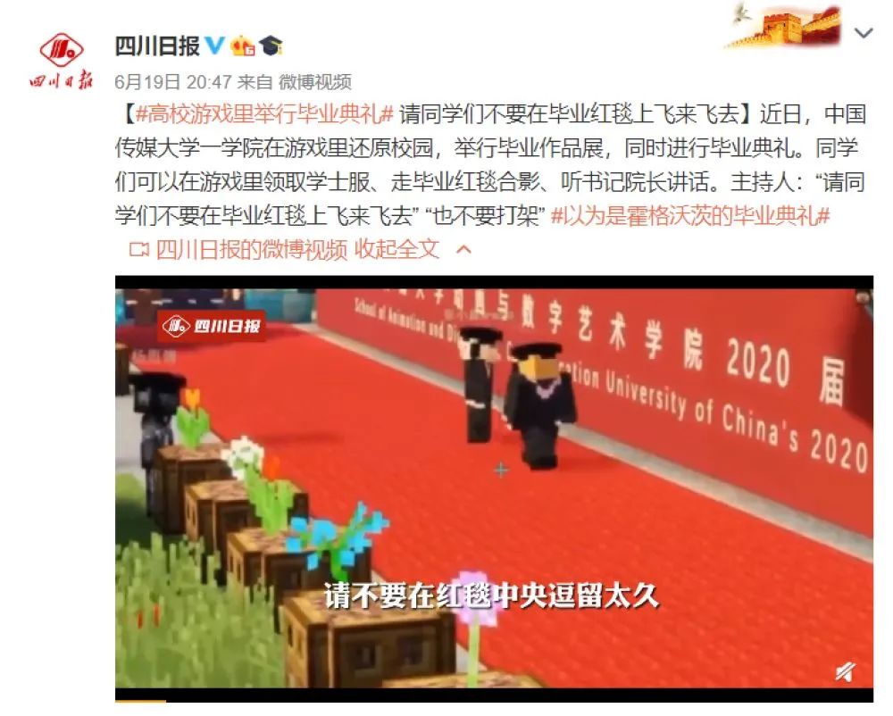 从南京邮电大学播放着毕业生头像画面的机器人,到中国传媒大学动画学院在游戏里还原校园举行毕业典礼,都在这个不太平静的夏天里给我们留下了笑容与难忘的画面。