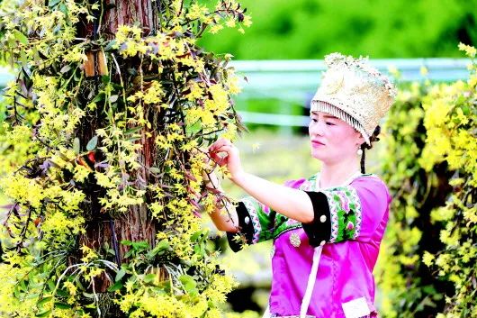 2006年,赤水金钗石斛被授予国家地理标志保护产品。近年来,赤水市多个乡镇积极推进生态农业与乡村旅游产业融合发展,采取“合作社+支部+农户”模式,引导农民在丹霞石上种植金钗石斛,助力脱贫攻坚和乡村振兴。种植金钗石斛不占良田熟土,且绿色环保,是赤水市实现可持续发展的“朝阳产业”,是走向乡村振兴道路的内生动力,更是创造百姓富、生态美“贵州画卷”的点睛之笔。