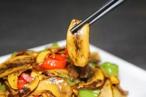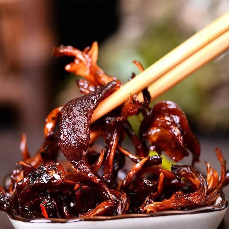 将新鲜的鸡枞撕丝,在油锅中加盐炒制,逼出香气,再用油封口。吃面,吃米线时浇上一勺,这滋味,你细品!