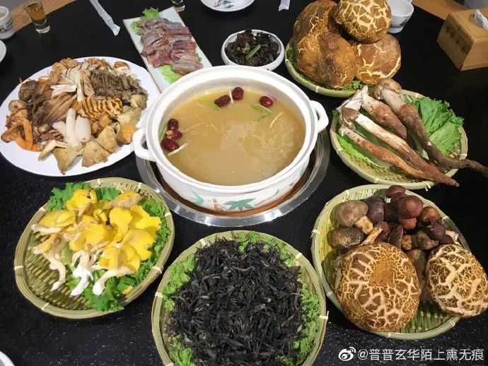 配菜:新鲜香菇、金针菇、黄丝菌、刷把菌、大脚菇、鸡丝菌、鸡枞菌、牛肝菌、竹荪等野生菌。