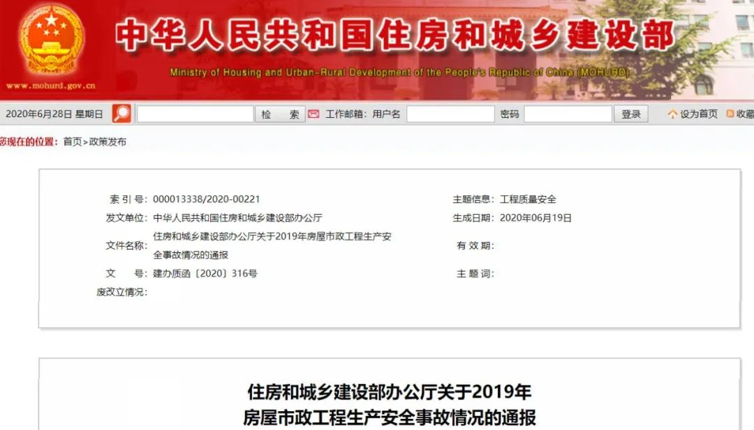 原标题:《住房和城乡建设部通报2019年房屋市政工程生产安全事故情况》