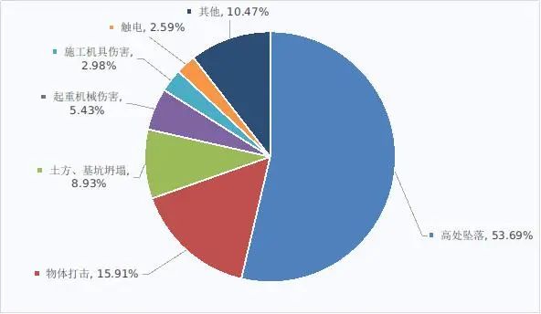 2019年,全国房屋市政工程生产安全事故按照类型划分,高处坠落事故415起,占总数的53.69%;物体打击事故123起,占总数的15.91%;土方、基坑坍塌事故69起,占总数的8.93%;起重机械伤害事故42起,占总数的5.43%;施工机具伤害事故23起,占总数的2.98%;触电事故20起,占总数的2.59%;其他类型事故81起,占总数的10.47%(见图5)。