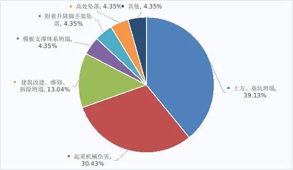 全国房屋市政工程生产安全较大及以上事故按照类型划分,土方、基坑坍塌事故9起,占事故总数的39.13%;起重机械伤害事故7起,占总数的30.43%;建筑改建、维修、拆除坍塌事故3起,占总数的13.04%;模板支撑体系坍塌、附着升降脚手架坠落、高处坠落以及其他类型事故各1起、各占总数的4.35%(见图6)。