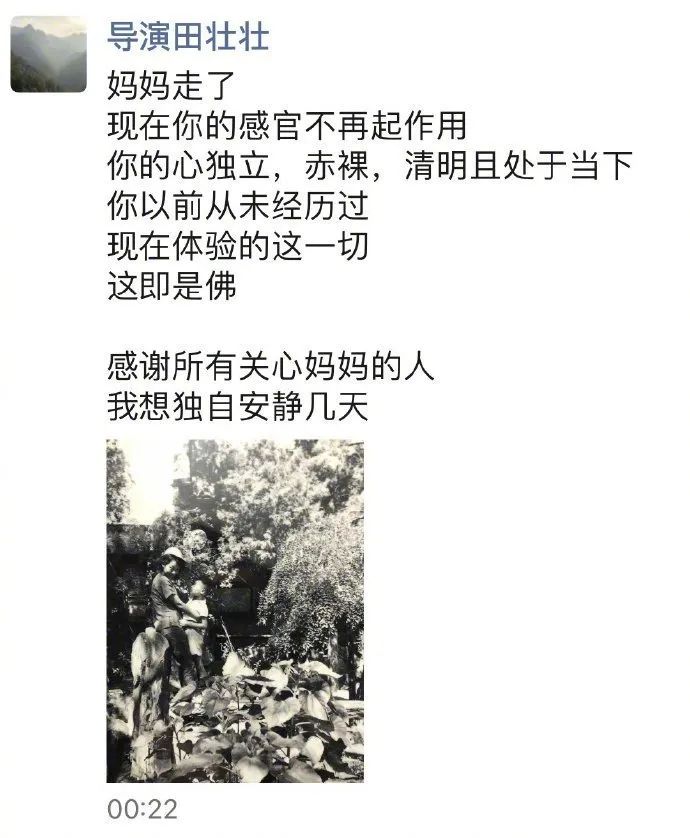 今日凌晨,导演田壮壮在朋友圈发文确认,于蓝去世。