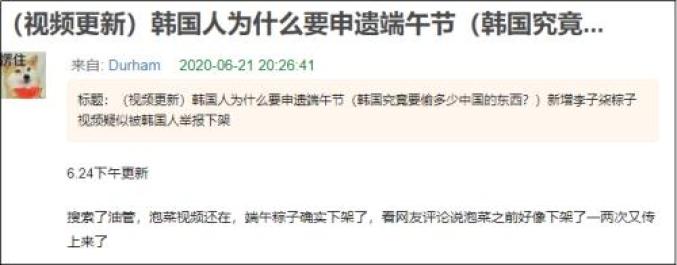 该消息的源头则为豆瓣用户@Durham 于6月21日发布,并在6月24日更新的一个帖子“韩国人为什么要申遗端午节(韩国人究竟要偷多少中国的东西?)”。