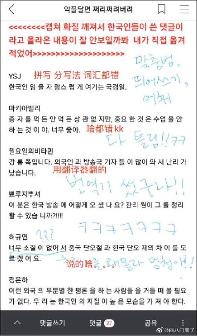 微博用户@西八门崩了 将Theqoo上的这个韩语帖子进行翻译后表示,应该是视频up主注册了假油管账号,先将自己想说的话翻译成生硬韩文,再发布到视频下面的评论里,最后再分别截图出来“翻译”成中文做成视频。