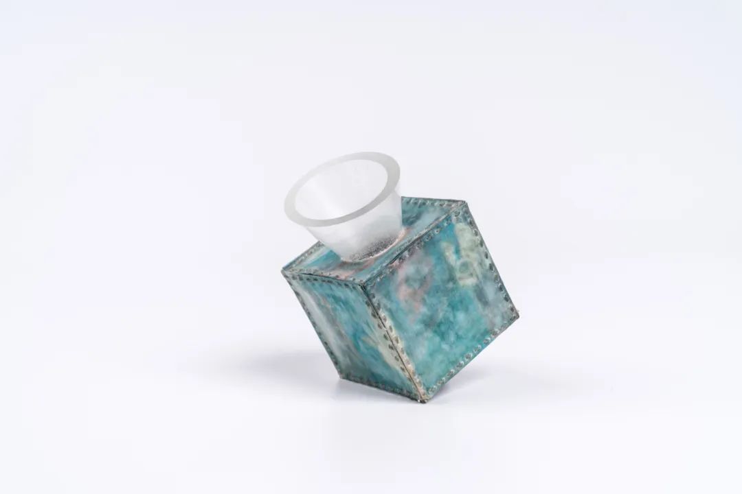 简介:昏暗的殿内,手持电筒观看壁画。当光束落在壁画上时,有惊讶,但更多是崇敬。浓郁沉稳的青绿色彩令人难忘,因此《壁·光·色》系列作品的灵感来源于借助手电观壁的实时感受。通过提炼色彩及电筒造型的特征元素,重新整合画面的叙事语言。并结合硫酸纸、树脂等材料进行影印、制模实验,以此达到壁画色彩在首饰中再现的目的。