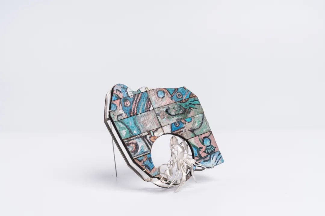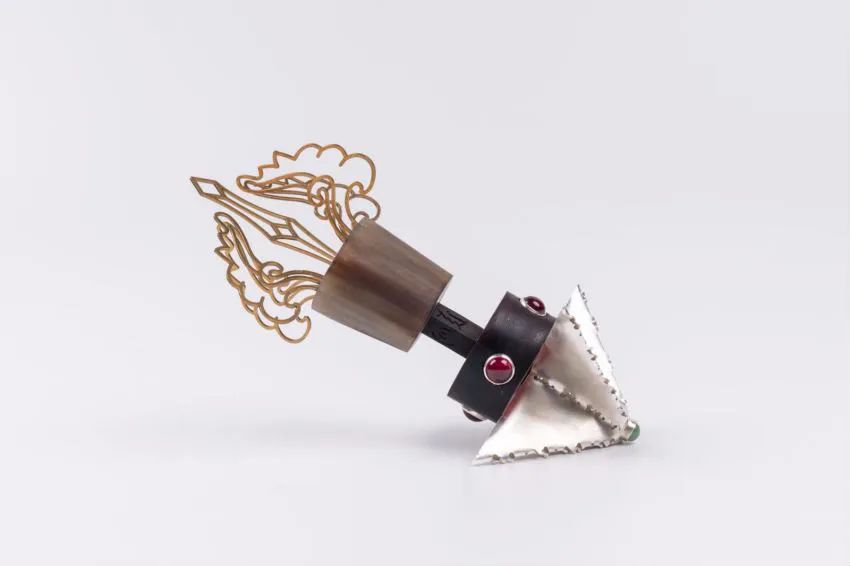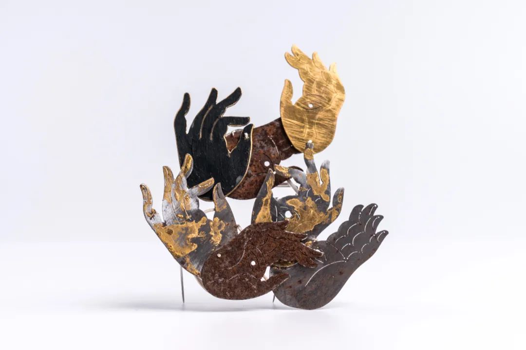 简介:作品灵感来源于浑源永安寺壁画中的明王形象,“明王”是佛教密宗佛、菩萨的化身,为了教化贪婪、愚昧的众生而示现出忿怒威猛相,对于沉溺与三毒中的众生即如当头棒喝,能令其猛然醒悟。作者用胸针这一配饰表达了她眼中每个明王形象最为别致的部分。