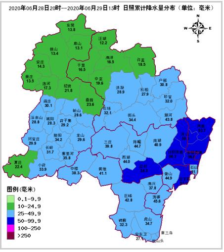 各区县平均降水量如下:东港区46.8毫米,岚山区37.2毫米,莒县23.9毫米,五莲县27.1毫米,经济技术开发区48.0毫米,山海天旅游度假区55.4毫米。