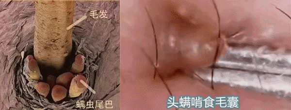 头螨分泌物过多造成头皮毛囊堵塞,油脂分泌失衡,