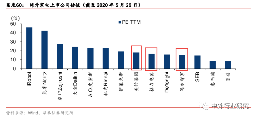 家电龙头个股有较稳定业绩表现,对标海外家电个股,家电龙头PE 估值并不高。