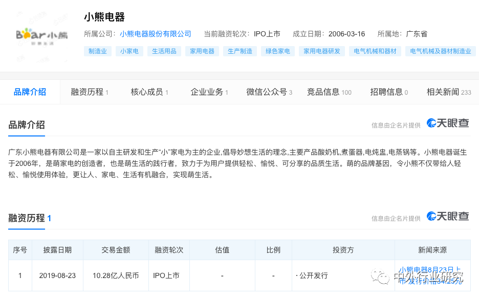 天眼查数据显示,广东小熊电器有限公司是一家以自主研发和生产“小”家电为主的企业,倡导妙想生活的理念,主要产品酸奶机,煮蛋器,电炖盅,电蒸锅等。
